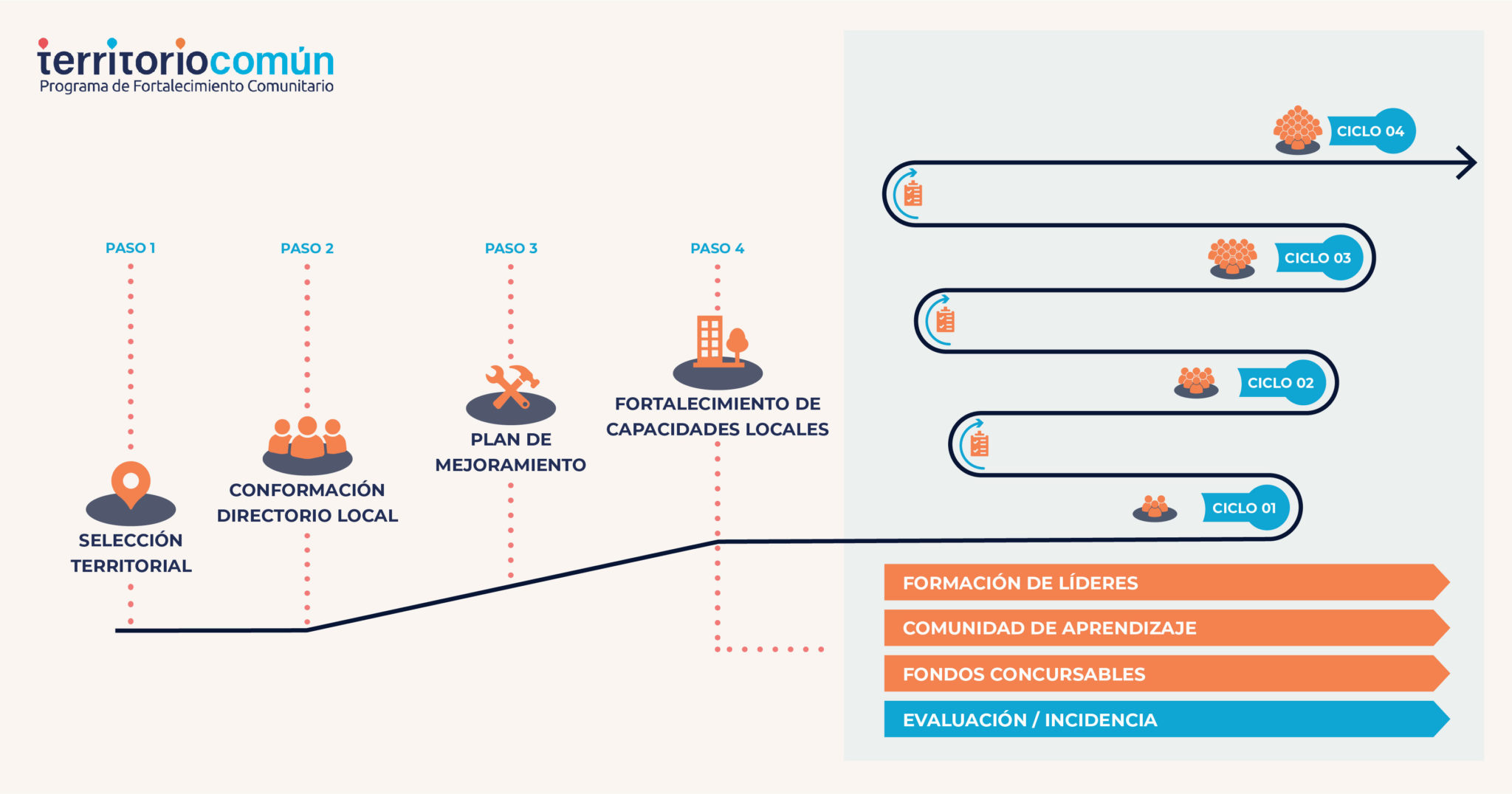 De manera transversal, se van identificando, compartiendo e incorporando aprendizajes por medio de una comunidad de aprendizaje que facilite el mejoramiento de modelos de trabajo comunitario. Esto estructurado en cuatro ciclos que tienen por objetivo que los liderazgos y organizaciones tengan oportunidades de desarrollar habilidades, proyectos, aprender y mejorar sus competencias en el proceso.